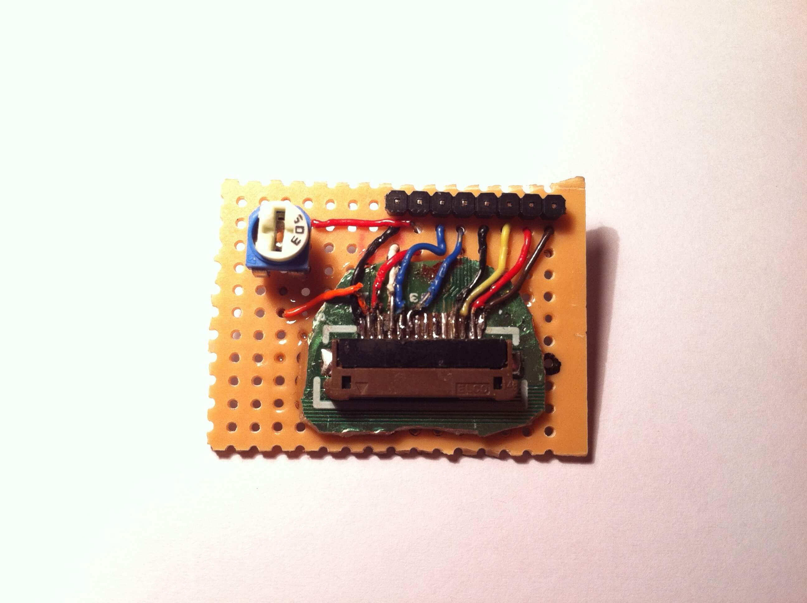I was quite happy in knowing this darn thing actually works! I built up a small breakout board so it could easily fit on a breadboard. I cut off a section from the printer PCB with the ribbon cable connecter, glued it to the breakout board and soldered connections from it, then put on a small potentiometer for the contrast adjustment. Here are some pictures of how it turned out: